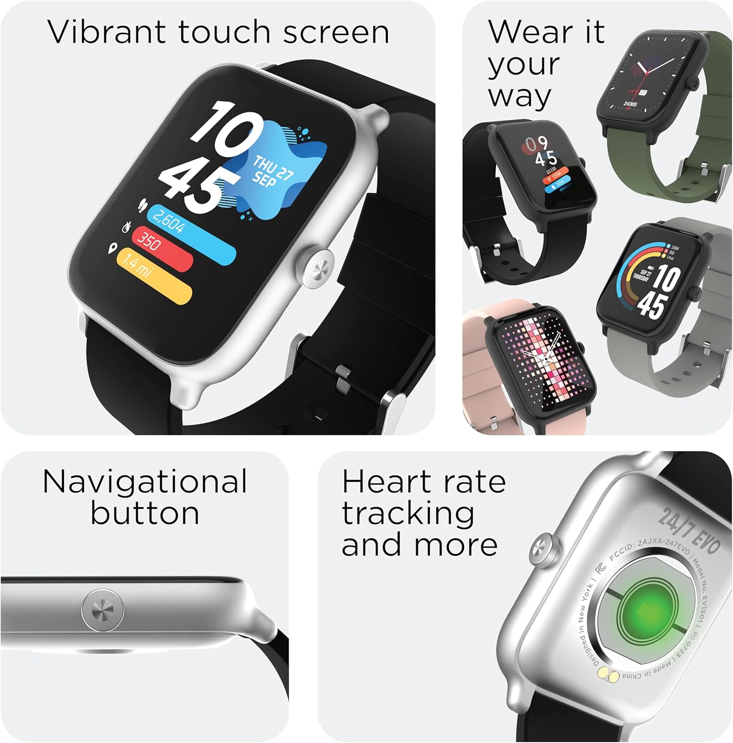 The 24/7 EVO smartwatch has a built-in 24/7 heart rate monitor and pedometer that automatically tracks your steps, calories burned, cardiovascular activity and sleep. Receive notifications for calls, texts and social media. Daily weather forecast on your wrist. Turn your 24/7 EVO into a shutter button with Camera Remote. Control your phone’s music without taking it out of your pocket with Music Remote. Set reminders to get up and move around when you’ve been sitting too long.