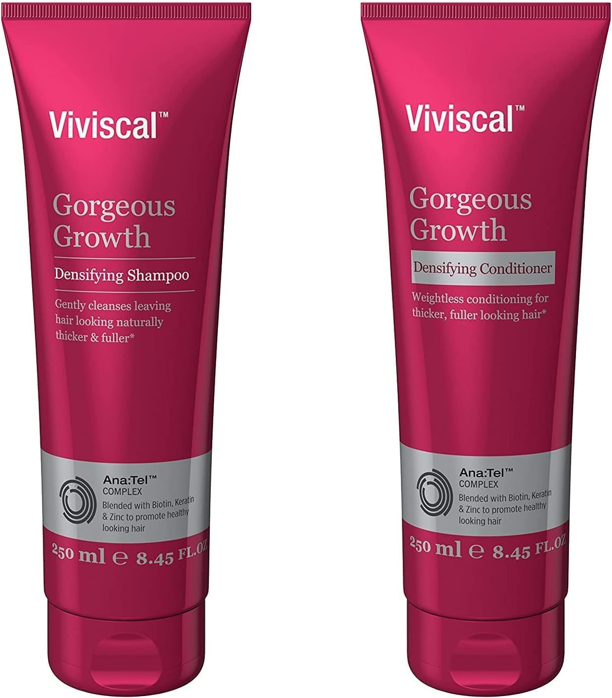 Viviscal Gorgeous Growth Densifying Shampoo & Conditioner is an everyday use hair routine for those who have normal and fine hair. This set creates thicker and voluminous hair. Leaves hair moisturized without weighing it down, protects your hair from becoming dry or dull. Made with a combination of biotin, keratin and zinc to promote healthy and thicker hair growth. Ingredients include Citric Acid, Sodium Benzoate, Panthenol, Hydrolyzed Keratin, Zinc PCA, Citrus Limon (Lemon) Peel Extract, Citrus Nobilis (Mandarin Orange) Fruit Extract, Citrus Aurantium Amara (Bitter Orange) Peel Extract, Citrus Aurantium Dulcis (Orange) Peel Extract, Cinnamomum Bark Oil, Lavandula Hybrida Oil, Kernel Oil, Patchouli Oil, Potassium Sorbate, Biotin, Coriander Seed Oil, Eucalyptus Globulus Leaf Oil, Limonene. Viviscal works with your body chemistry to make hair look healthy and fuller from the inside & outside. Can be used by all hair types including dry, damaged, color treated, fine and thin hair.