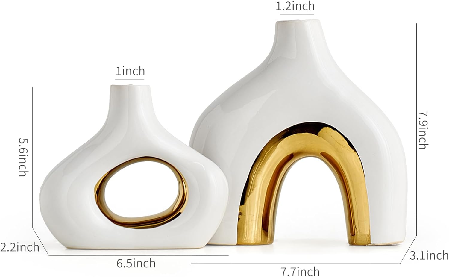 Size: The white gold vase measures 6.29 x 1.96 x 5.31 inches and 7.28 x 2.75 x 7.48 inches respectively.