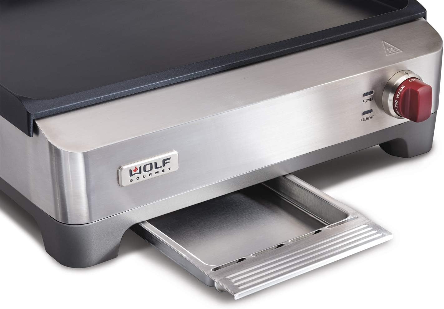 The Wolf Gourmet Griddle is designed with a thick, cast aluminum cooking surface mirroring the precision, quality and look of a Wolf built-in griddle. The 12 by 17 inch professional-grade surface offers superior nonstick coating, and a 1/2 inch deep rim adds more control while turning or stirring your favorite foods.